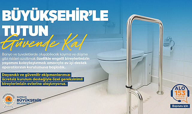 Samsun Büyükşehir Belediyesi, özel bireylerin ev içi güvenliğini artırmak amacıyla banyo ve tuvaletlere ücretsiz tutunma aparatı kurulumuna başladı. "Büyükşehir’le Tutun Güvende Kal" projesi için başvurular 153 Çözüm Merkezi üzerinden alınıyor.