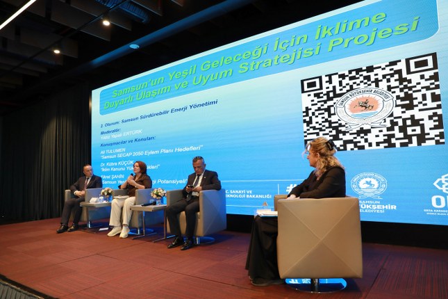İkinci oturumda “Samsun Sürdürülebilir Enerji Yönetimi” başlığı işlendi. İl Enerji Yöneticisi Yıldız Yapalı Ertürk’ün moderatörlüğünü yaptığı oturumda; SBB İklim Değişikliği ve Sıfır Atık Dairesi Başkanı Ali Tulumen “SECAP 2050 Eylem Planı Hedefleri”ni, Çevre Mühendisleri Odası Başkanı Dr. Kübra Küçük “İklim Kanunu Yükümlülükleri”ni, TEİAŞ Bölge Müdürü Fikret Şahin ise “Samsun’un Yenilenebilir Enerji Potansiyeli”ni anlattı.