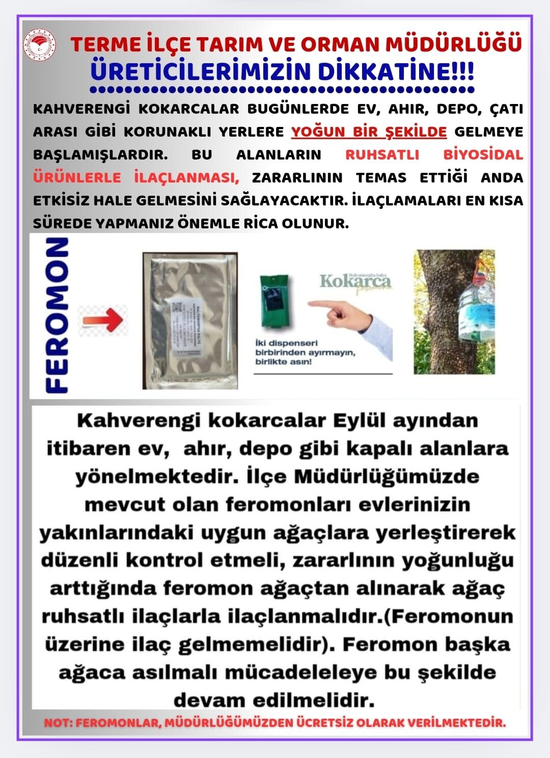 İlçe Tarım ve Orman Müdürlüğü tarafından üreticilere ücretsiz feromon desteği sağlandığını belirten Demir, üreticilerin bu feromonları ev ve bahçe çevresindeki uygun ağaçlara yerleştirerek düzenli kontrol yapmalarını önerdi.