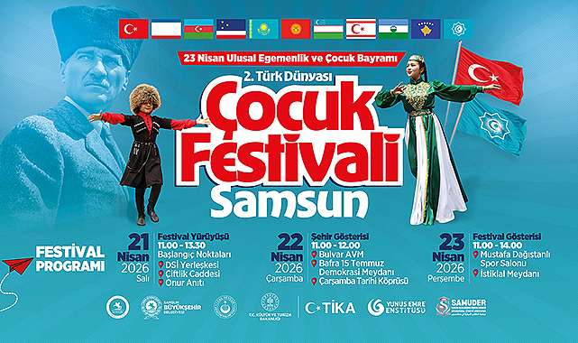 Samsun Türk Dünyası Çocuk Festivali kapsamında 9 farklı ülkeden toplam 113 katılımcı yer alacak. Festival programı, 21 Nisan’da saat 11.00’de başlayacak yürüyüş ile açılacak. Çocuklar, kortej halinde Çiftlik Caddesi üzerinden ilerleyerek Onur Anıtı’na ulaşacak.